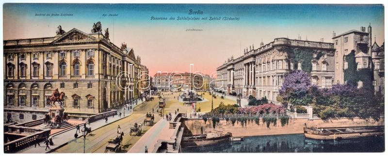 Berlin, Panorama des Schlossplatzes mit Schloss (Südseite), Denkmal des Grossen Kurfürsten, Kgl. Marstall, Schlossbrunnen / 4-tiled unfolded panoramacacard (r)