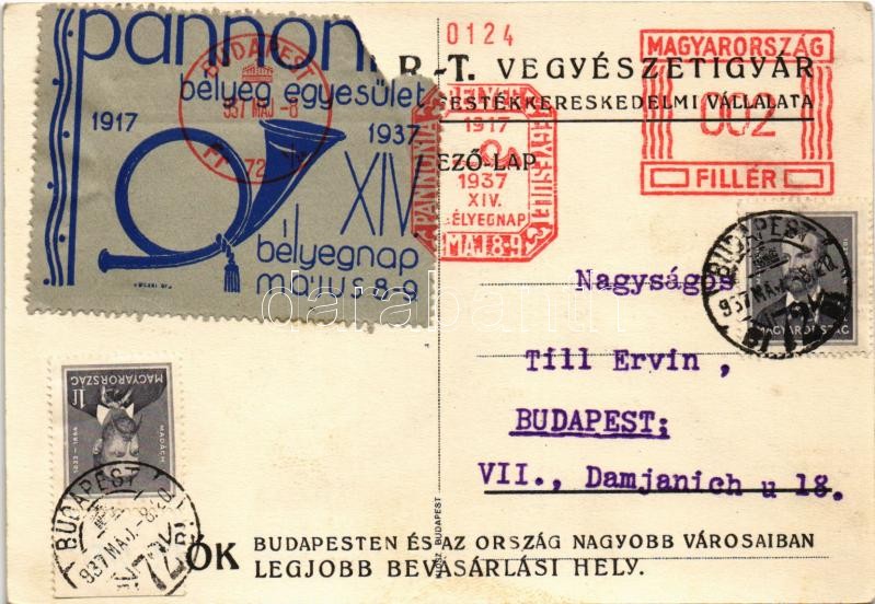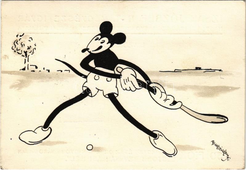 1937 Mickey egér gyeplabda játék közben. Klösz korai Disney képeslap / Mickey Mouse playing field hockey, early Hungarian Disney postcard s: Bisztriczky + "1937 Pannonia Bélyeg Egyesület Bélyegnap" So. Stpl