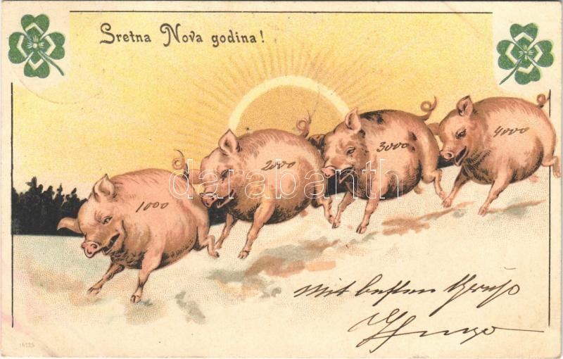1901 Stretna Nova godina / Újévi üdvözlet malacokkal / New Year greeti... https://www.darabanth.com/de/38-Gross-Auktion/38.1/Ansichtskarten/GruC39Fkarten-Feste~15743/1901-Stretna-Nova-godina-Ujevi-udvozlet-malacokkal-New-Year-greeting-with-pigs-Art-Nouveau-~II2366425