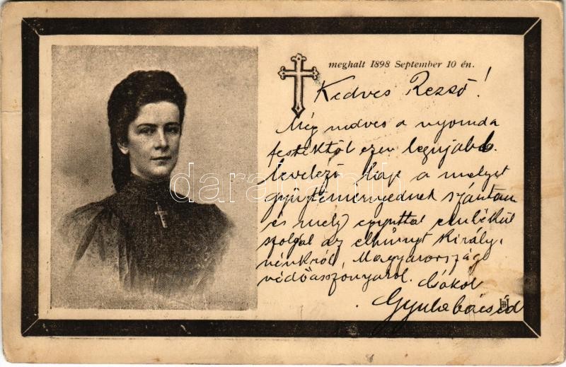 1898 (Vorläufer) Erzsébet királynő (Sissi) gyászlapja. Meghalt 1898 Szeptember 10-én / Obituary postcard of Empress Elisabeth of Austria (Sisi) (ragasztónyom / gluemark)