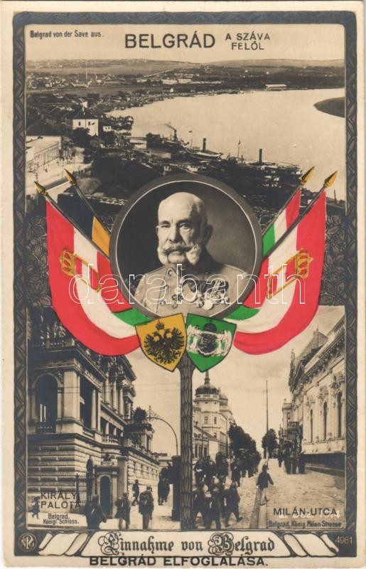 Ferenc József, Belgrád elfoglalása / Einnahme of Belgrad / Franz Joseph I of Austria, the Occupation of Beograd, WWI Austro-Hungarian K.u.K. military propaganda, coat of arms and flags