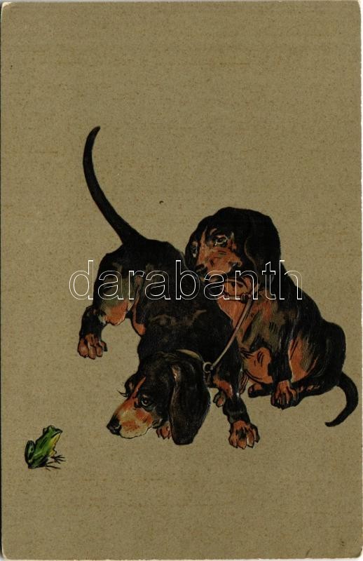 Beschreibung: Tacskók. Dombornyomott litho / Dachshund dogs. Embossed litho