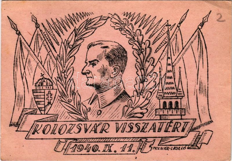 1940 Kolozsvár visszatért. Szecessziós irredenta Horthy Miklós arcképé... https://www.darabanth.com/de/38-Gross-Auktion/38.1/Ansichtskarten/Irredenta~15709/1940-Kolozsvar-visszatert-Szecesszios-irredenta-Horthy-Miklos-arckepevel-Tabori-postai-leve~II2615915