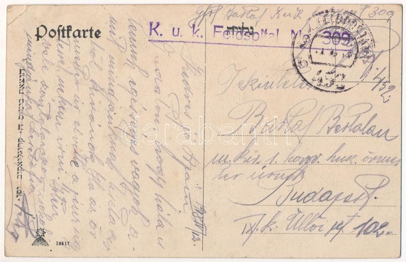1918 Első világháborús magyar katona képeslapja Izraelből: Azok a zsidók kik ide lesznek telepítve ilyen jól berendezett faluba laknak. héber nyelv / Letter from a WWI Hungarian soldier from Israel, Hebrew language + "K.u.K. Feldspital No. 309." (EK)