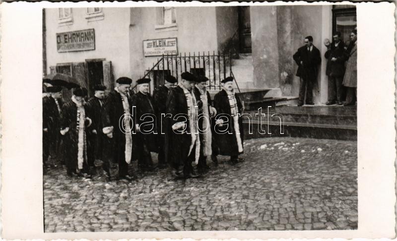 Máramarosi zsidók az utcán, háttérben Klein József mészáros és D. Ehrmann üzlete. Judaika / Jewish men on the street in Maramures, shops in the background. Judaica, photo