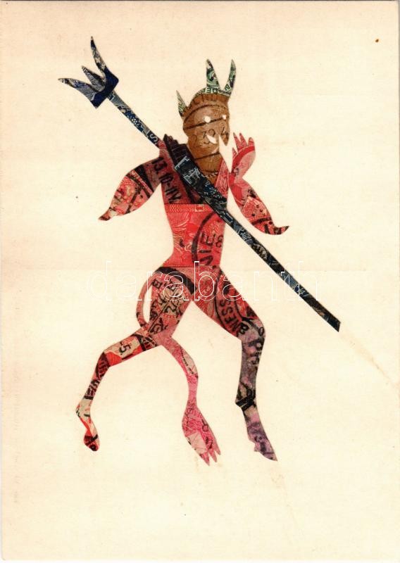 Beschreibung: Krampusz. Bélyegekből kivágott és összeragasztott képeslap. Budai nyomda / Krampus. Made out of stamps