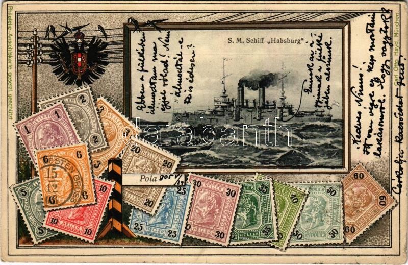 1903 SMS Habsburg az Osztrák-Magyar Haditengerészet Habsburg-osztályú pre-dreadnought csatahajója. Dombornyomott bélyeges szecessziós litho montázs / K.u.K. Kriegsmarine Schlachtschiff. Philatelie Ansichtskarte Carl Otto Hayd / Austro-Hungarian Navy battleship SMS Habsburg. Embossed Art Nouveau litho with stamps (Rb)