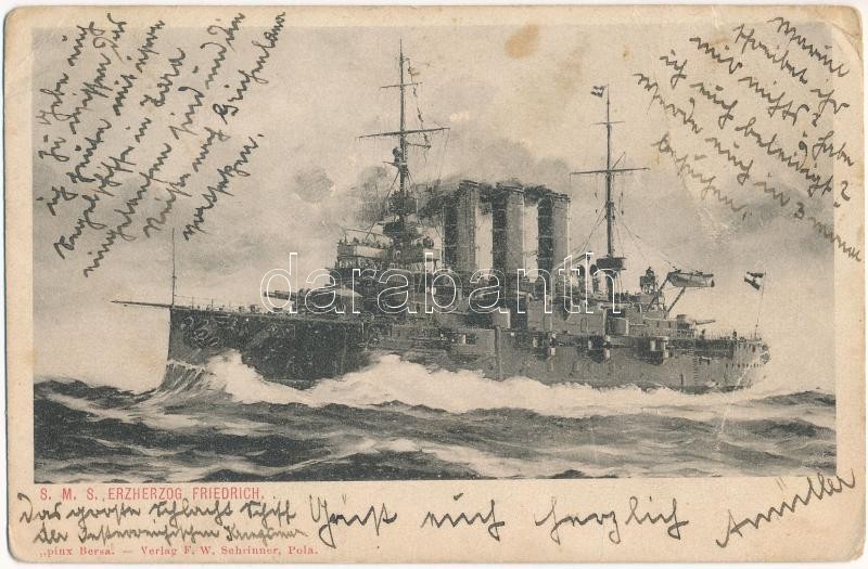 1905 SMS Erzherzog Friedrich az Osztrák-Magyar Haditengerészet pre-dre... https://www.darabanth.com/de/38-Gross-Auktion/38.1/Ansichtskarten/Kriegsschiffe~15702/1905-SMS-Erzherzog-Friedrich-az-Osztrak-Magyar-Haditengereszet-pre-dreadnought-csatahajoja-Ku~II2617901