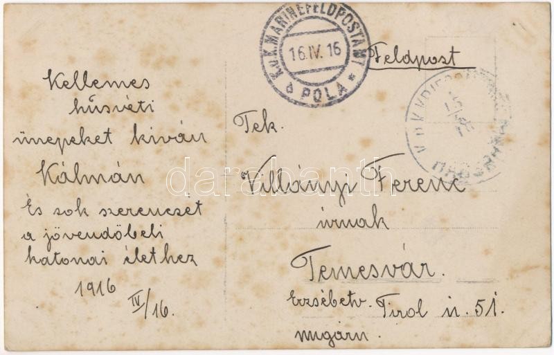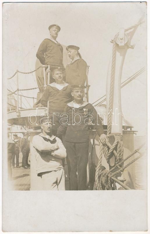 Beschreibung: 1916 SMS Habsburg Osztrák-Magyar Haditengerészet Habsburg-osztályú pre-dreadnought csatahajója, matrózok a fedélzeten / K.u.K. Kriegsmarine Schlachtschiff / WWI Austro-Hungarian Navy battleship SMS Habsburg, mariners on deck. photo + "K.u.K. Marinefeldpostamt" (fl)