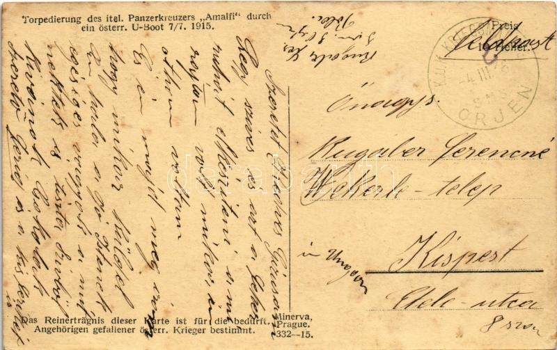 Beschreibung: K.u.K. Kriegsmarine. Torpedierung des ital. Panzerkreuzers "Amalfi" durch ein österr. U-Boot 7/7. 1915. / Osztrák-magyar tengeralattjáró megtorpedózza az "Amalfi" olasz páncélos cirkálót + "K.U.K. KRIEGSMARINE S.M.S. ORJEN" (fl)