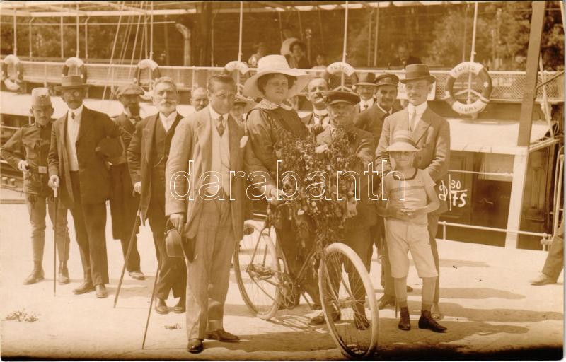 Beschreibung: 1913 Abbazia, Opatija; Füred-Fiume hajókirándulás, hölgy kerékpárral, Burza Károly. Fotogr. Atelier Betty / boat trip, lady with bicycle. photo