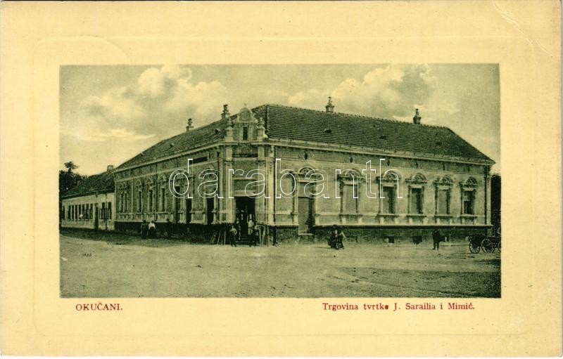 1914 Okucsány, Okucani; Trgovina tvrtke J. Sarailia i Mimic. Naklada J. Sarailie i Mimica / J. Sarailia és Mimic üzlete és saját kiadása. W.L. Bp. 7340. / shop (EK)