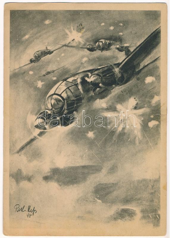 Heinkel-Kampfflugzeuge stossen durch das Sperrfeuer englischer Flakbatterien. Der Adler die grosse Luftwaffen-Illustrierte / German WWII military aircraft / Német második világháborús katonai repülőgép s: R. Hess (fa)