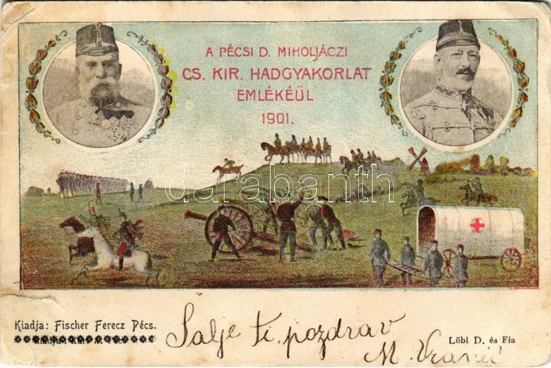 1901 Pécs-D. Miholjáczi (Alsómiholjáci) cs. kir. hadgyakorlat emlékéül. Ferenc József, József Károly Lajos főherceg. Löbl D. és fia, Karl A. / In memory of the presence of his Majesty the Emperor during the autumn maneuvers, Austro-Hungarian K.u.K. military art postcard. Franz Joseph, Archduke Joseph Karl of Austria in Pécs and Donji Miholjac. Art Nouveau (r)