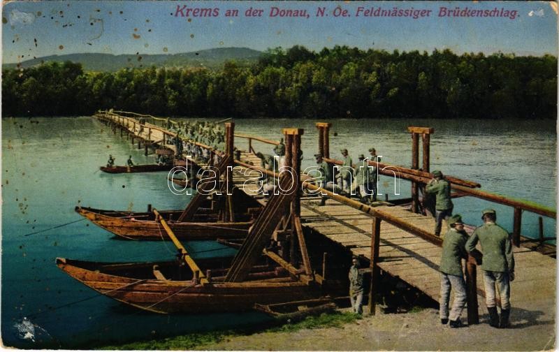 1912 Krems an der Donau, Feldmässiger Brückenschlag / Osztrák-magyar katonák ideiglenes híd építése közben / K.u.k. military, soldiers building a provisional bridge (EB)
