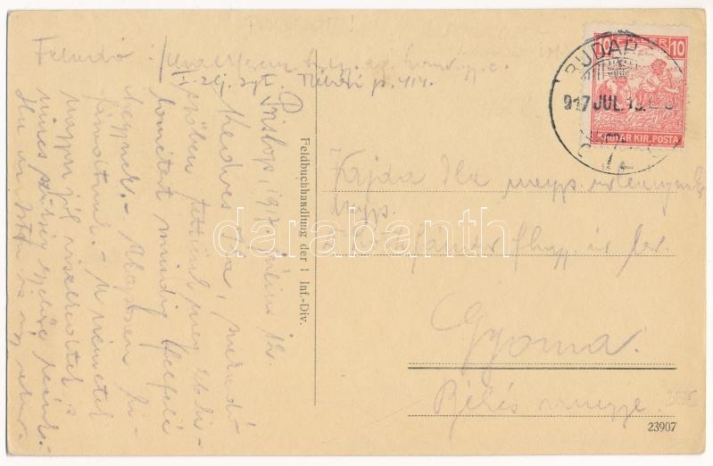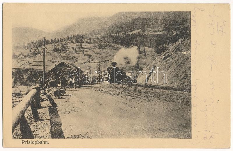 1917 Első világháborús osztrák-magyar vasútállomás a Borsa-Priszlop-Jakobeny keskeny nyomtávolságú gőzüzemű tábori vasútvonalon az erdélyi hegyekben. Prislopbahn gőzmozdony és katonák / WWI K.u.K. military railway station of the Borsa-Prislop-Iacobeni narrow gauge steam powered field railroad in the Transylvanian mountains, soldiers and locomotive. Feldbuchhandlung der 1. Inf.-Div.