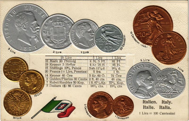 Beschreibung: Italien - Münzenkarte und Nationalflagge. Max Heimbrecht / Olaszország - érmék és zászló. Dombornyomott / Italian coins and flag. Embossed, litho
