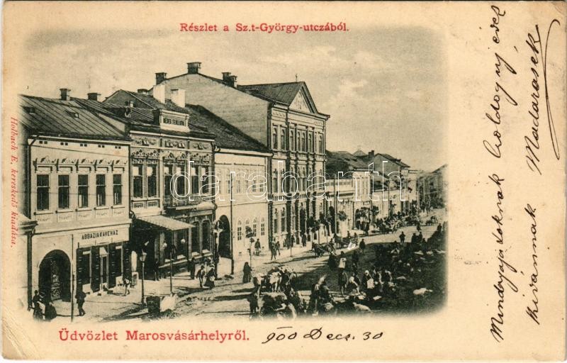 1900 Marosvásárhely, Targu Mures; Szent György utca részlete, piac, Abbazia Kávéház, Méder szálloda. Holbach E. kiadása / street, market, cafe and hotel (EK)