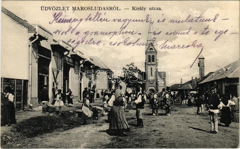 1913 Marosludas, Ludosul de Mures, Ludus; Király utca, templom, piac, ... https://www.darabanth.com/de/38-Gross-Auktion/38.1/Ansichtskarten/Siebenburgen~15646/1913-Marosludas-Ludosul-de-Mures-Ludus-Kiraly-utca-templom-piac-Mihaly-Moritz-uzlete-Glu~II2591793