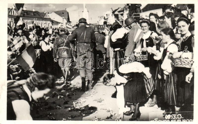 1940 Kolozsvár, Cluj; bevonulás, honleányok a katonák által megtaposott rózsákért nyúlnak / entry of the Hungarian troops, compatriot women reach for the roses stomped by the soldiers, So. Stpl
