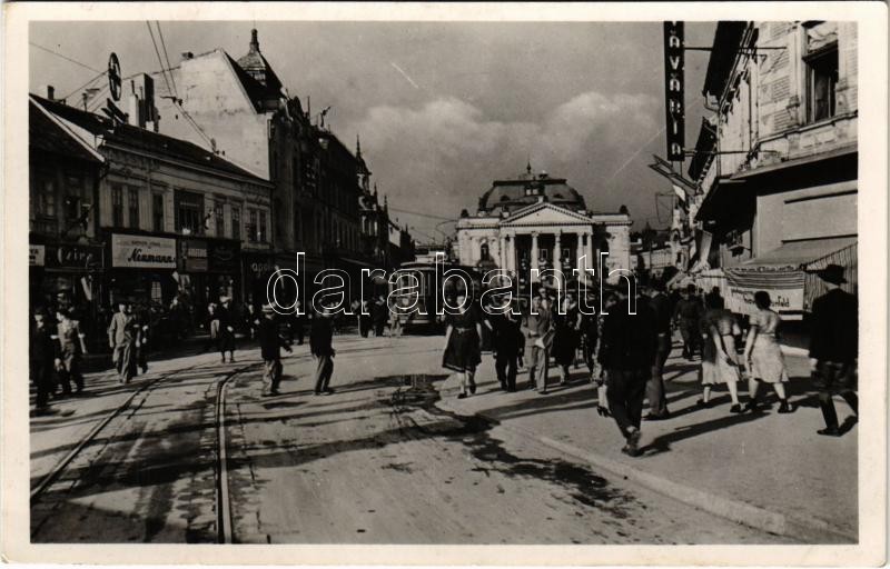 1941 Nagyvárad, Oradea; Bémer tér, villamos, színház, Kávéház, Czira, Neumann és Apollo üzletek / square, theatre, tram, shops