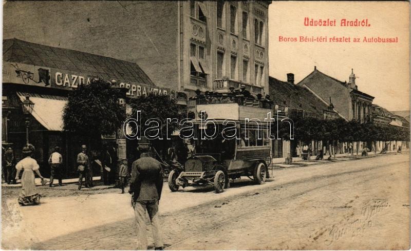 Beschreibung: Arad, Boros Béni tér, emeletes autóbusz, Gazdasági gépraktár. Kerpel Izsó kiadása, Ruhm Ödön felvétele / square, double decker autobus, shop (fl)