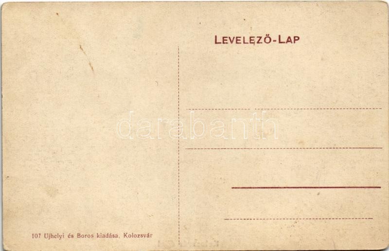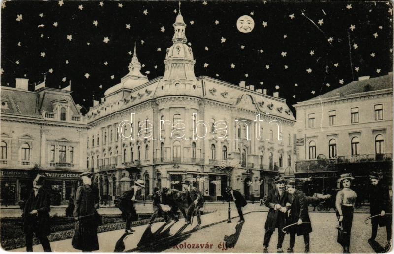 Kolozsvár, Cluj; Schuster, Tauffer Dezső és Schefer üzlete. Éjjeli montázs részeg férfiakkal. Újhelyi és Boros kiadása / shops, night montage with drunk men