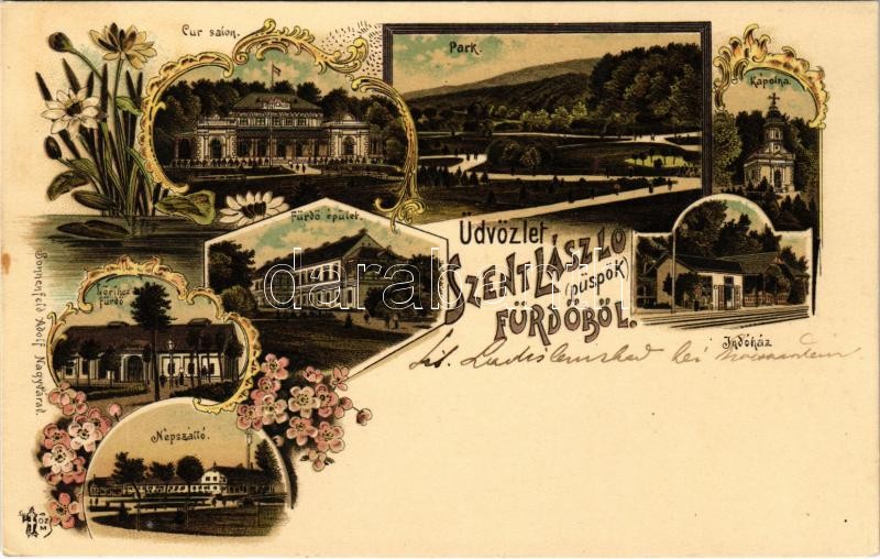 Püspökfürdő, Szentlászlófürdő, Baile 1 Mai; fürdő épület, indóház, vasútállomás, park, Lőrinc fürdő, Népszálló. Sonnenfeld Adolf kiadása / spa, railway station, park, hotel. Art Nouveau, floral, litho
