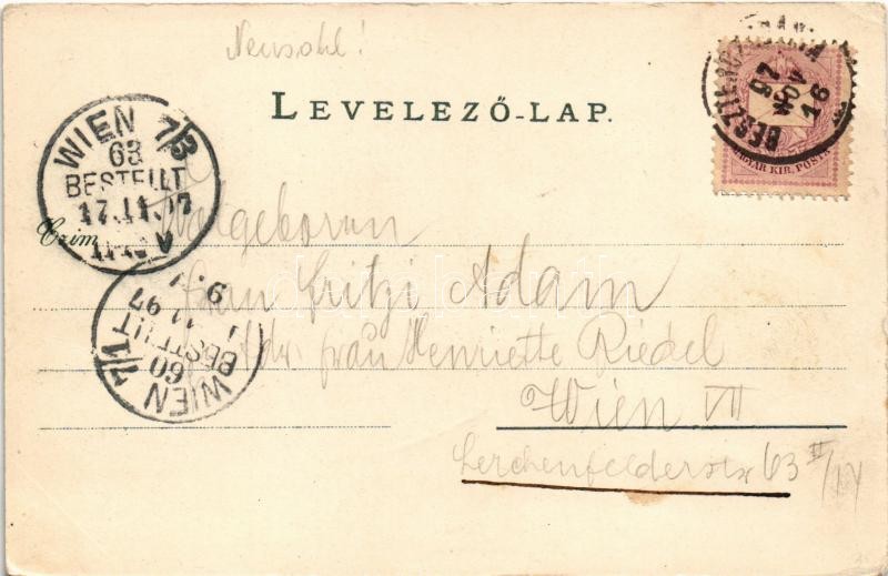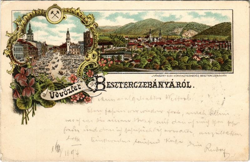 Beschreibung: 1897 (Vorläufer!) Besztercebánya, Banská Bystrica; Fő téri piac. Ivánszky Elek kiadása / market. Art Nouveau, floral, litho (EK)