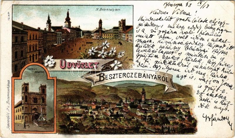 1898 (Vorläufer) Besztercebánya, Banská Bystrica; IV. Béla király tere, Káptalan templom. Sonnenfeld Mór kiadása / square, church. Art Nouveau, floral, litho (EK)