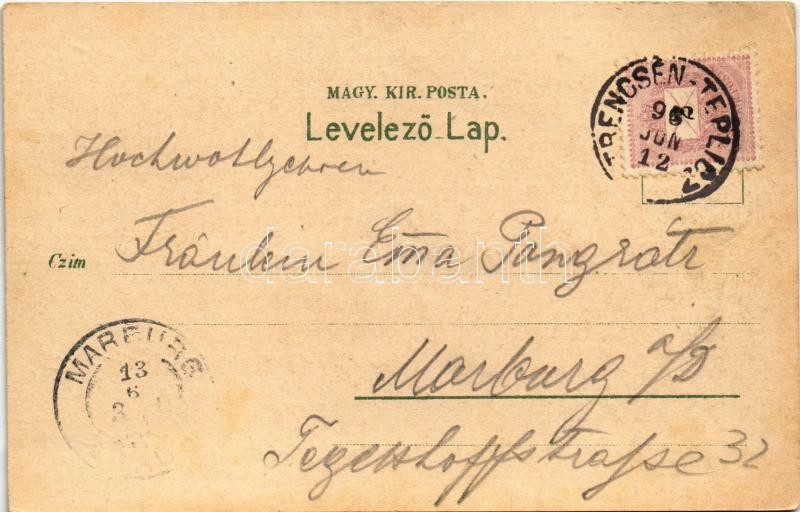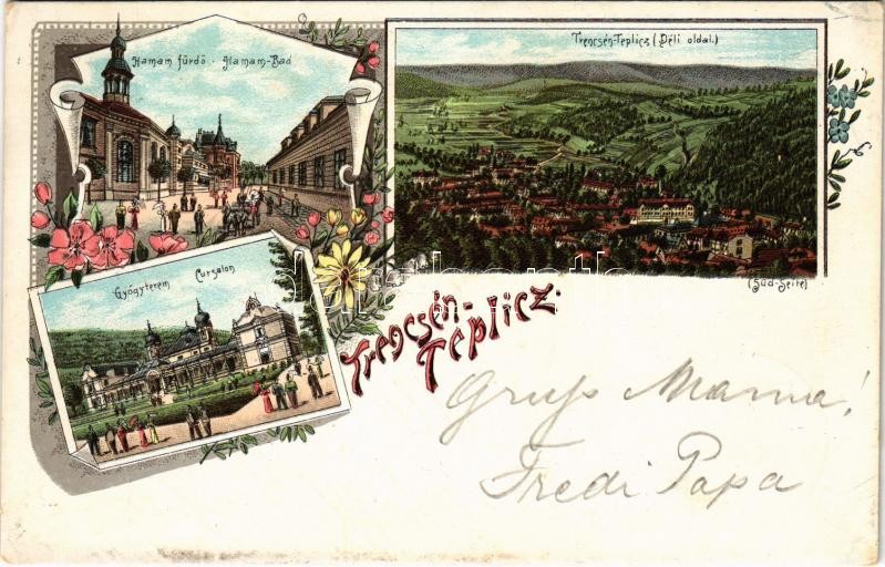 Beschreibung: 1898 (Vorläufer) Trencsénteplic, Trencianske Teplice; Hamam fürdő, gyógyterem, déli oldal / Bad, Cursalon / Turkish spa, sanatorium. Art Nouveau, floral, litho