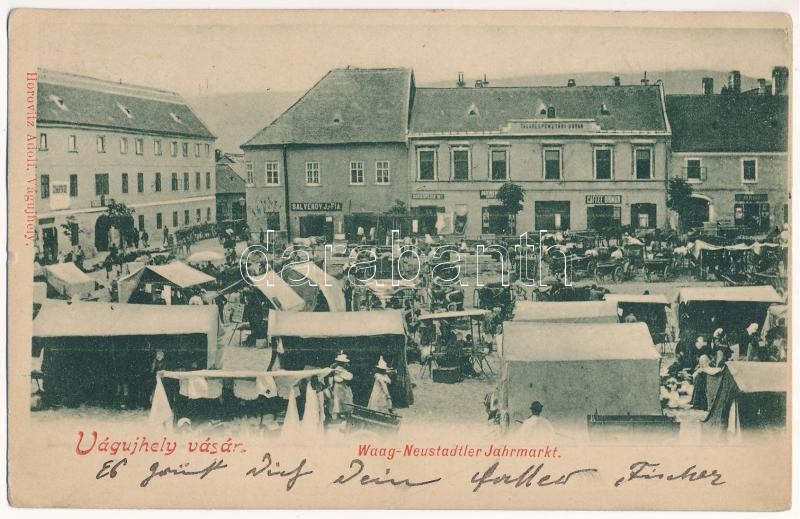 1900 Vágújhely, Waag-Neustadt, Nové Mesto nad Váhom; Vásár, piac, Takarékpénztári udvar, Salvéndy J. és fia, David Spitzer és Rosenberg Salamon üzlete, Birman kávéház / market, savings bank, shops, cafe