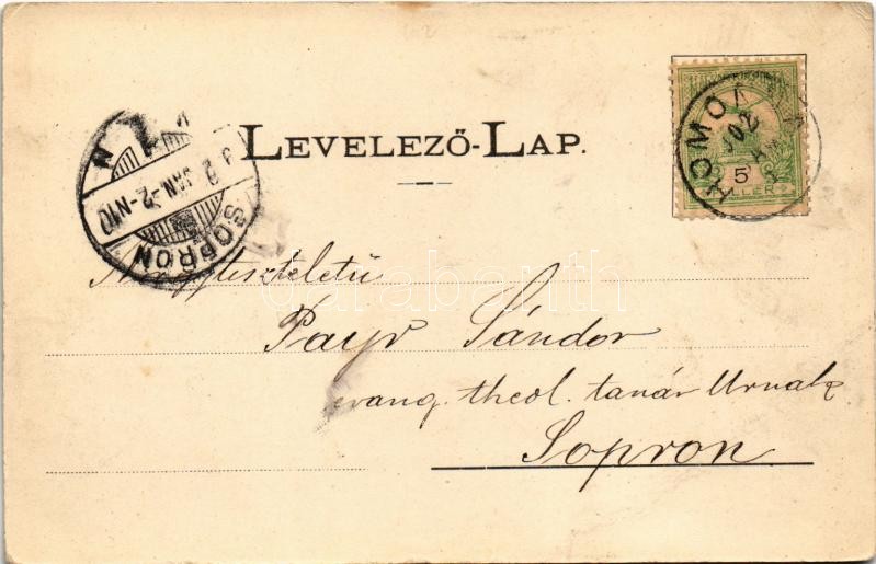 1902 Homonna, Homenau, Humenné; Fő utca, Felső kereskedelmi iskola, Gróf Andrássy kastély, tél, gyógyszertár, Friedmann Samu és Neuman Adolf üzlete. Fejes Jakab kiadása / main street, school, castle, winter, shops, pharmacy. Art Nouveau, floral (EK)