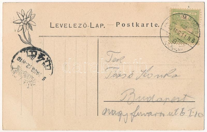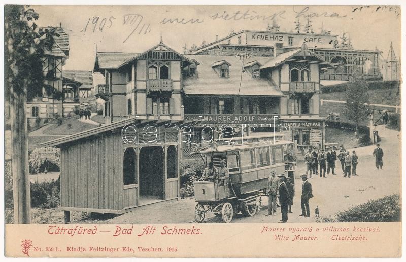 1905 Tátrafüred, Ótátrafüred, Altschmecks, Stary Smokovec (Tátra, Magas-Tátra, Vysoké Tatry); Izabella Háziipar üzlete, Maurer Adolf Kassáról, Kávéház, Poprád-Felka-Tátrafüred vonalú korai trolibusz. Feitzinger Ede No. 959. L. / shops, cafe, early trolley autobus of the Poprad-Velká-Smokovec line
