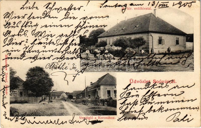 Beschreibung: 1905 Tótsóvár, Sóvár, Solivar; M. kir. erdőhivatal, Vendéglő a Koronához. Krisztman József kiadása / forestry office, hotel and restaurant