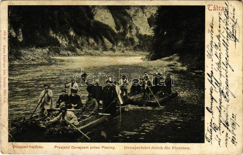 1908 Tátra, Magas Tátra, Vysoké Tatry; Dunajeci hajózás, tutajok magyar zászlókkal. Feitzinger Ede Nr. 355. Kr. 1905/4 m. / Przejazd Dunajcem przez Pieniny / Dunajecfahrt durch die Pieninen / rafting with Hungarian flags (fa)