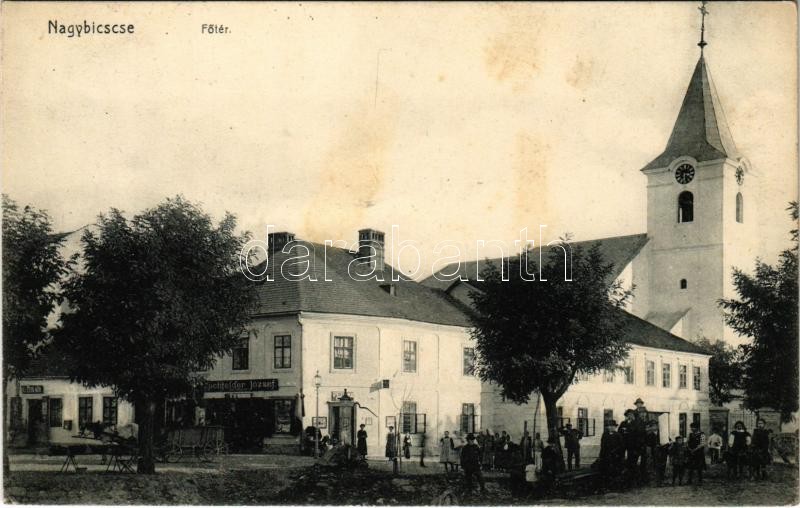 1909 Nagybiccse, Nagy-Bittse, Bytca: Fő tér, templom, Ifj. Kohn Mór és Hochfelder József üzlete. Sonnenfeld Vilmos kiadása / main square, church, shops (fl)