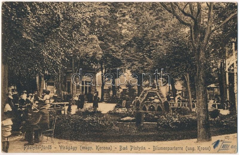 Beschreibung: 1909 Pöstyén-fürdő, Bad Pistyán, Kúpele Piestany; Magyar korona virágágyás / Blumenparterre (ung. Krone) / Hungarian crown flower bed
