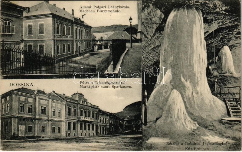 1912 Dobsina, Dobschau; Állami polgári leányiskola, Fő tér, Takarékpénztár, jégbarlang belső a kúttal, Altstock Ede üzlete. Köhler Gyula kiadása / girl school, main square, savings bank, ice cave interior, shop