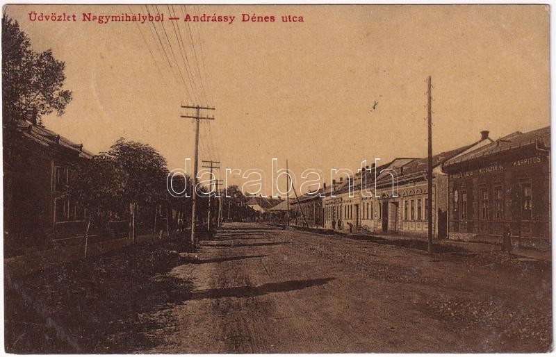 1916 Nagymihály, Michalovce; Andrássy Dénes utca, Kardos Lajos kocsigy... https://www.darabanth.com/de/38-Gross-Auktion/38.1/Ansichtskarten/Slowakei~15649/1916-Nagymihaly-Michalovce-Andrassy-Denes-utca-Kardos-Lajos-kocsigyarto-es-karpitos-uzlet~II2616908