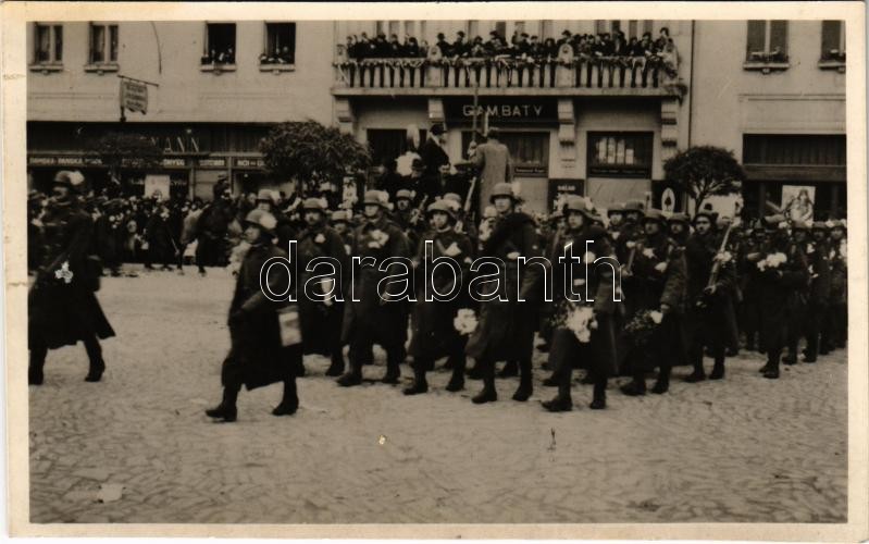 1938 Léva, Levice; bevonulás, Gambaty üzlete. Foto Hajdu / entry of th... https://www.darabanth.com/de/38-Gross-Auktion/38.1/Ansichtskarten/Slowakei~15649/1938-Leva-Levice-bevonulas-Gambaty-uzlete-Foto-Hajdu-entry-of-the-Hungarian-troops-shops-~II2599828