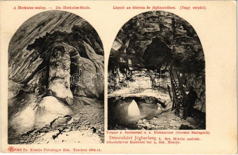Beschreibung: Deménfalu, Demanová (Liptószentmiklós, Liptovsky Mikulás); Üdvözlet a deményfalvi jégbarlangból. Jégcsap, Lépcső az étterem és jégkamrához, nagy cseppkő, Herkules oszlop. Feitzinger Ede Ps. 662. 1904-14. / Demanovská ladová jaskyna / ice cave interior