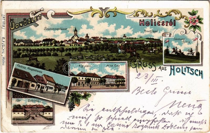 Holics, Holic, Holitsch; Lóverseny, Szarvasvadászat, Régi piac, Fő utca, vár. G. Fischl / horse race, deer hunting, main street, castle. Art Nouveau, floral, litho (fa)