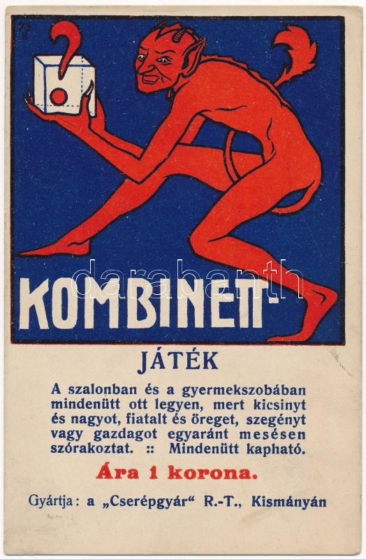 Kismánya, Malá Mana (Mánya); Cserépgyár rt. által gyártott Kombinett-játék reklámja, Krampusz / game advertisement made by the tile factory, Krampus s: R.G.B.