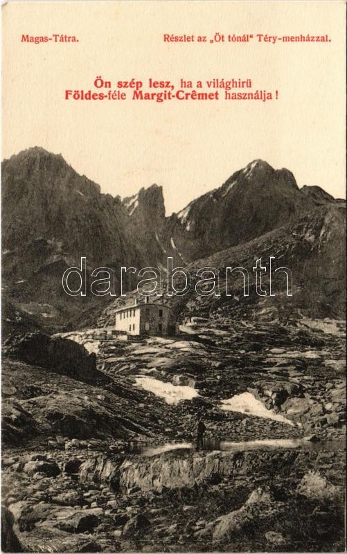 Tátra, Magas-Tátra, Vysoké Tatry; Részlet az Öt tónál a Téry menházzal. Ön szép lesz, ha a világhírű Földes-féle Margit Cremet használja! reklám / chalet, cosmetic cream advertisement