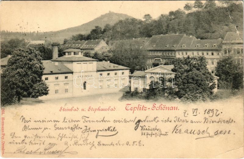 1897 (Vorläufer) Teplice, Teplitz-Schönau; Steinbad u. Stephansbad / s... https://www.darabanth.com/de/38-Gross-Auktion/38.1/Ansichtskarten/Tschechische-Republik~15666/1897-Vorlaufer-Teplice-Teplitz-Schonau-Steinbad-u-Stephansbad-spas-EB~II2578529