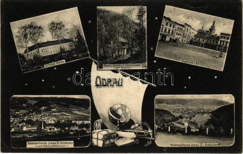 1905 Odry, Odrau; Schloss, Stadtplatz, Hanns Ulrich's I. Felsenkeller (Ulrichsbräu), vom Pohorschberge / castle, main square, restaurant, beer hall, brewery. Art Nouveau