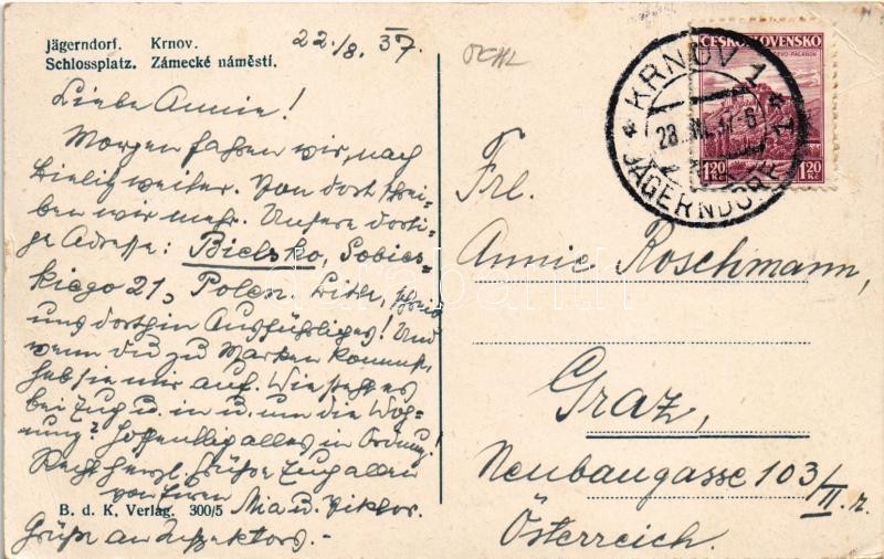 1937 Krnov, Jägerndorf; Schlossplatz / Zámecké námestí / castle square... https://www.darabanth.com/de/38-Gross-Auktion/38.1/Ansichtskarten/Tschechische-Republik~15666/1937-Krnov-Jagerndorf-Schlossplatz-Zamecke-namesti-castle-square-shops-EK~II2598028