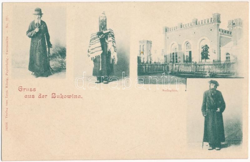 Beschreibung: Sadhora, Sadagóra, Sadigura; Gruss aus Bukowina / Jewish types from Bukovina, Judaica, synagouge. Leon König No. 227.