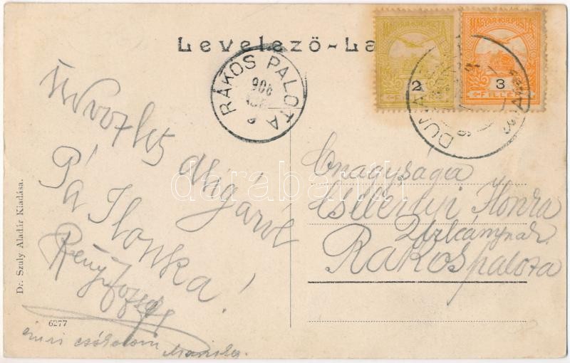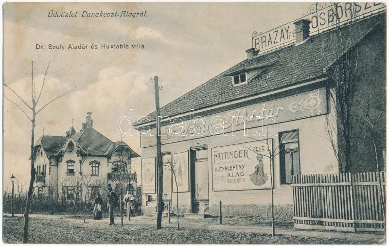 Beschreibung: 1906 Dunakeszi-Alag, Dr. Szuly Aladár üzlete, Fattinger féle húsrostos kutyalepény és Brázay-féle sósborszesz reklám, Huxtable villa. Dr. Szuly Aladár kiadása